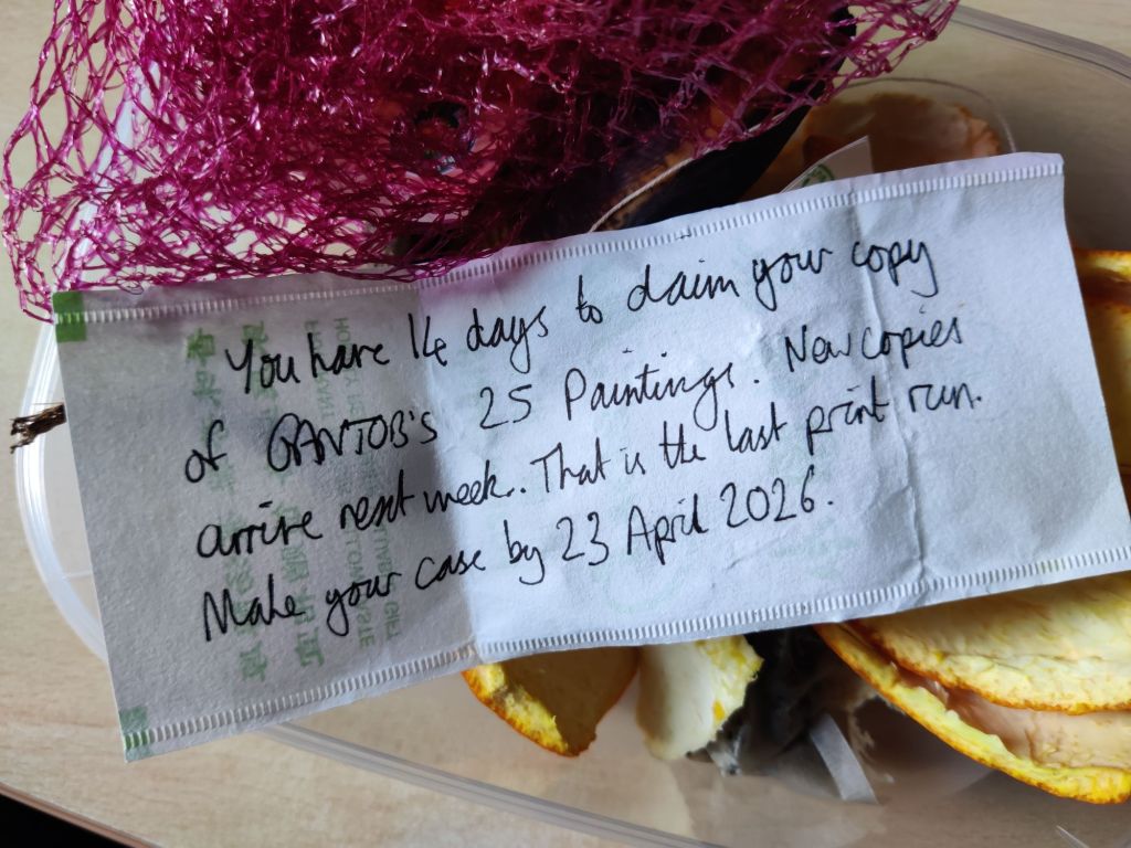 Anyway, I hope when the dust settles on the strange incidents around the death of GANTOB, that the rest of ‘The 25 Paintings’ do indeed resurface and make their way to those who helped in its creation, albeit inadvertantly!