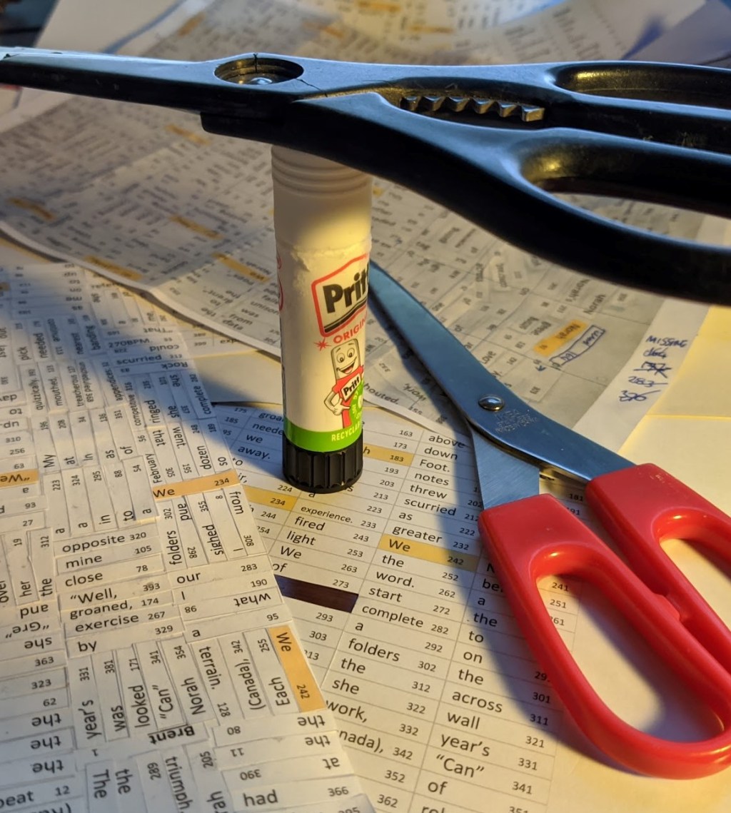 In reality, progress this weekend has been glacial (at their pre-global warming pace) and very, very sticky. There is Pritt Stick tackiness everywhere: on my hands, as residue on the little “snips”, and on the previously pristine piece of paper.