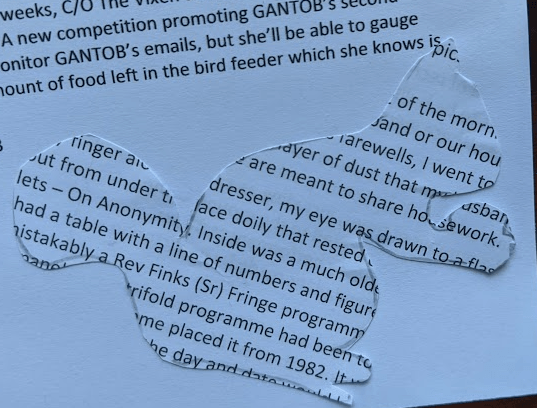 The handle turns and Red Squirrel readies herself, tail curled around her burden. A narrow gap opens and she’s off, careering across the sharp stones, through the heather, across the burn, into the trees. She burrows for a few minutes and finds her stash, adding the new book to a collection of other number themed Bill Drummond books. She is storing these up for book drops across the UK over coming weeks, c/o The Vixen and other helpers. Vehicles for a new GANTOB pamphlet. A new competition promoting GANTOB’s second book of 2023. She can’t monitor GANTOB’s emails, but she’ll be able to gauge the response from the amount of food left in the bird feeder which she knows is really for her.