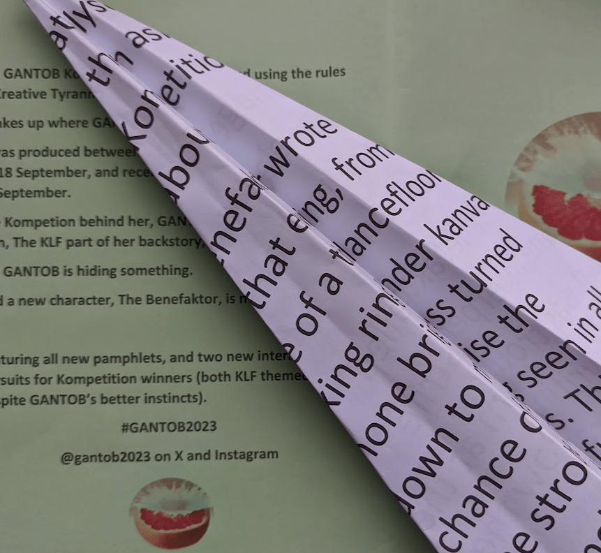 Towards the end of August I had received a rather long email from The Benefaktor’s personal akount (not one of his direktorship akounts). He did not use the name “The Benefaktor” of course – that came later. Paraphrasing, he wrote that he had found one of my Pamphlet Planes under Regent Bridge in Edinburgh. This paper plane was promoting my original Kompetition – see Pamphlet 6 “Kultural Vandalism”. The Benefaktor detailed some interpersonal strife that was troubling him at the time of writing, and how the distraction caused by drafting his email had somehow catalysed that argument, then asked what “it” (The Kompetition I think) was all about.