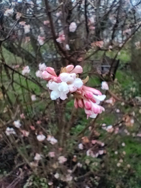 On Wednesday I set out to the Nostalgia Café where I volunteer most weeks. Out of my usual routine and having had a rush with the baking I took a shortcut through the local park grateful for my choice of boots. And there was the first tree. It was a funny gnarly thing with offshoots off the main trunk. A hawthorn with a small crop of last year’s berries shrivelled on the stems but also a fresh display of fully formed pink blossom on the newer growth. No bees or birds to enjoy the heady perfume. I took a photo as evidence, the morning gloom failing to do its blooms justice.