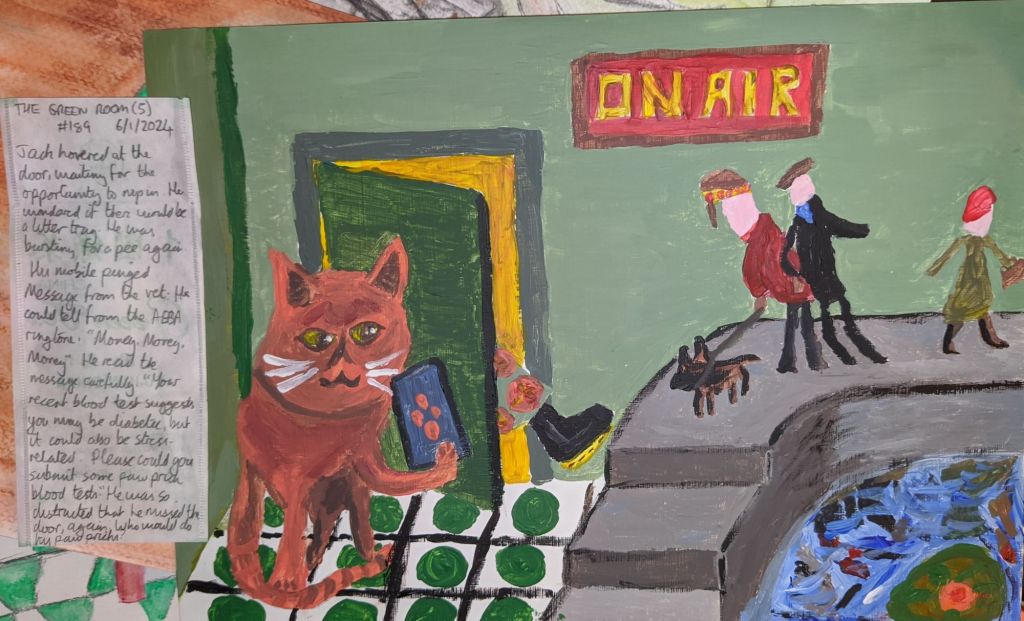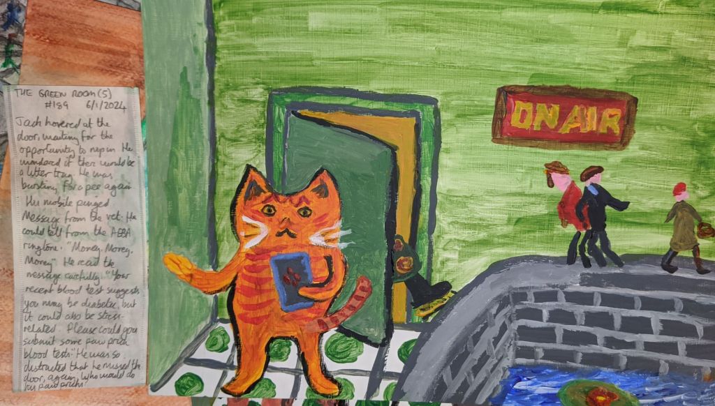 I have been experimenting with acrylic paints (or indeed any painting) for the first time. Which do you prefer? And do you recognise the figures on the wall from a specific painting by a real artist?