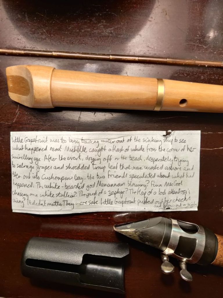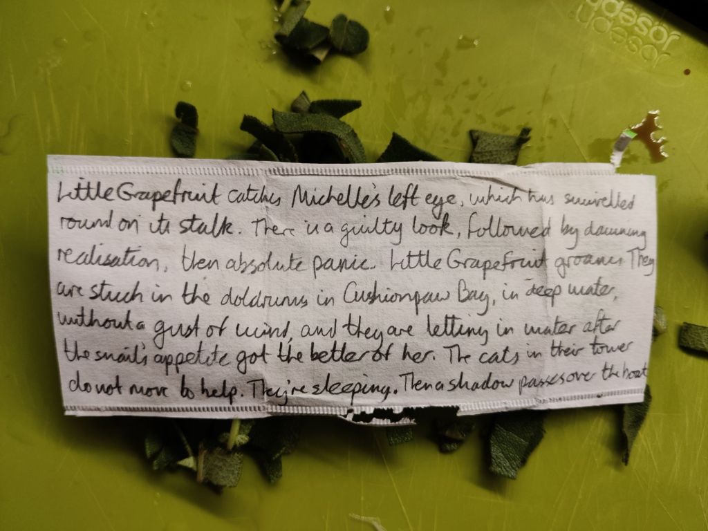 We will perhaps never know what my mum planned with her Little Grapefruit At Sea sequence. Her opening sentence in the excerpt I am sharing today frames this as a beginning, but written in the past tense. It refers, however, to events we have already read about in previous posts, some of which were written in the present tense. The ordering of these pieces is therefore challenging and up for interpretation. A loop of time perhaps, like Varo.