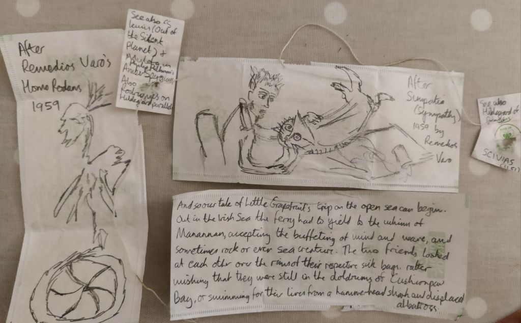 My mum appears to have seen echoes of Hildegard of Bingen in the work of Remedios Varo (Catalan artist, exiled to Mexico 1908-1963). I can see similarities between an illumination in Hildegard’s book Scivias (1151) and some of Varo’s paintings. I see from a Google search that others, including Francisco Rabasso Rodrigues commented on parallels between the two women, noting Varo’s “esoteric practices, and her relation to time as circular or simultaneous”. I learned about this when reading about a manuscript Varo prepared on a sculpture called Homo Rodans. She penned that essay under the pseudonym Hälikcio von Fuhrängschmidt, fictional anthropologist. Going by the sketches I have found as bookmarks, my mum appears to have found the same Wikipedia articles as me.