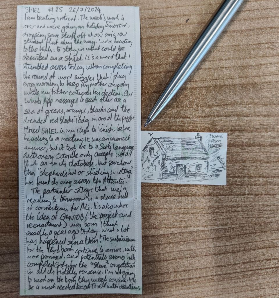 The projected image is shown below (phone torch, shining through blueberry container with story written in sharpie, capturing shadow on artist notepad on lino floor in darkened shower room). If this photo was one of the “outcomes” it would be a fail. Back to the drawing board. Attempts at your own projected story, on objects destined for recycling, will be considered for dissemination.