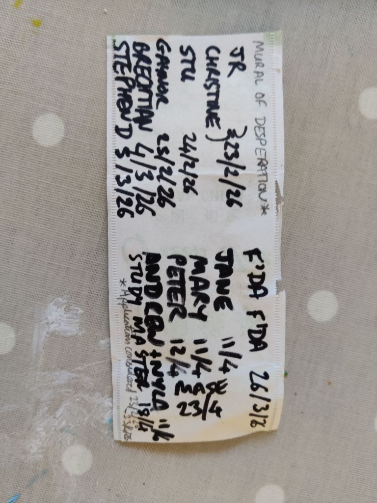 The mural of desperation was established in the final stages of preparing the 5th GANTOB book, Who Killed GANTOB? (GANTOB Books, 2026). The purpose of this construction is explained in that book. If you are an original recipient of the 5th book then you can apply to be added to the wall. This will unlock the 4th book, GANTOB’s 25 Paintings (GANTOB Books, 2025).