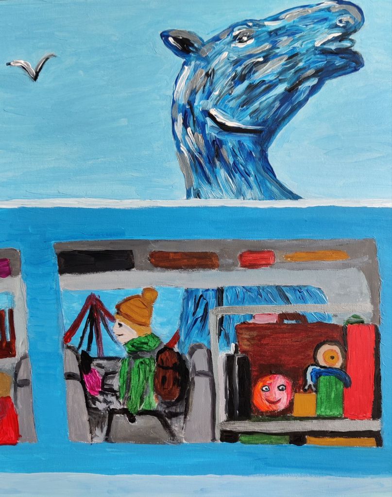 Little Grapefruit boarded the train behind Michelle, balancing on the ramp the station staff use to load the catering trolley. Apparently the barista (Homo sapiens) was stuck at Carlisle. The two friends took window seats of a sort, lodged between cases but with a view outside. It was a beautiful winter’s day, sunshine low over rooftops black from generations of coal and steam. Past a factory with tall chimneys, a warehouse district and a silver kelpie (each-uisge), six storeys high, muzzle craning upwards as if whinnying. Beyond the city they could see a volcano and a suspension bridge, waiting.