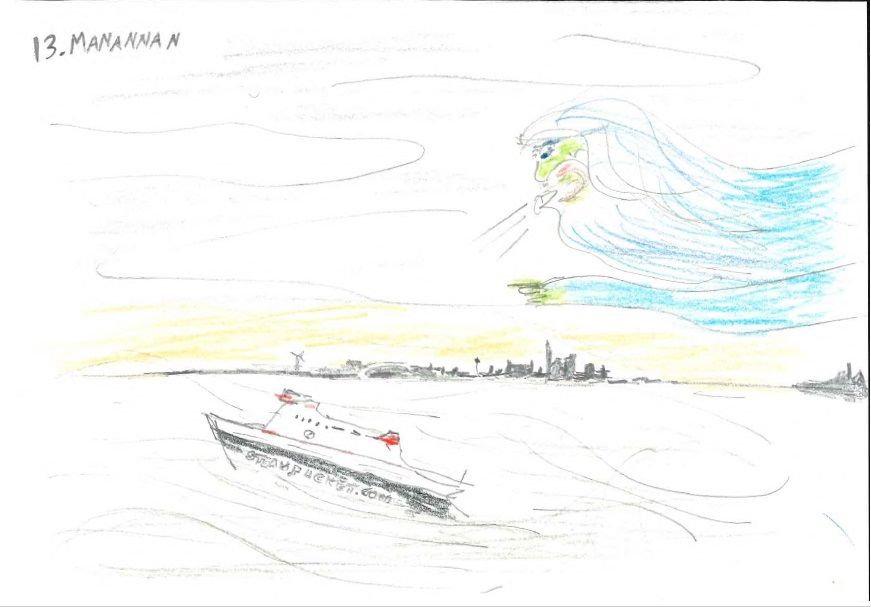 High up on Snaefell, the mountain that dominates the middle of the Isle of Man, a hare (Lepus timidus) munched on heather (Calluna vulgaris). The events in Douglas Bay, behind St Mary’s Isle, were revealed to her in snatches of parallax. The mist of the god Manannan’s limbs, beard and fingers crept across the still waters. Sometimes it parted to show the Manxman ferry as it decelerated into the port, halting if the way was not clear. Seabirds (various) formed the final moving part of this maritime triptych, chasing the fish (predominantly Pollachius pollachius) that followed the deity and ship.