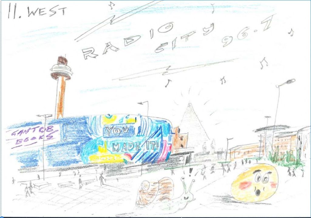 Little Grapefruit and Michelle rushed out of the station, keen to check the ferry timetable. They found themselves in the centre of town, pavements glistening with rain, the shadow of a huge tower cast long over a hotchpotch of squares offering retail, leisure and art galleries. Michelle surmised that this town was called “Radio City 96.7”. Little Grapefruit quickly corrected her. Despite favourable conditions for snails, her zesty friend raced ahead, careering through a shopping centre with a roof garden, along Mathew Street and down to the waterfront.