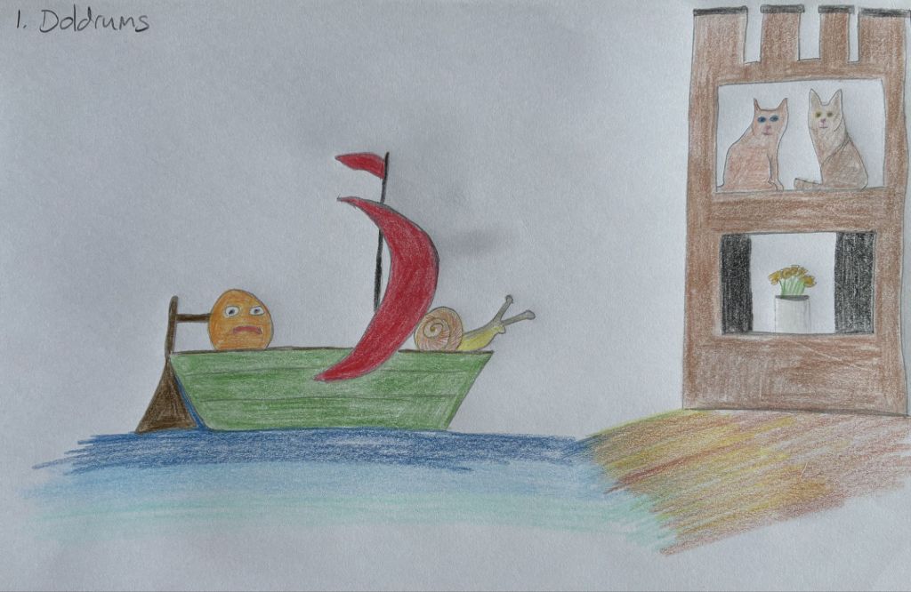 Little Grapefruit (Citrus × paradisia) and Michelle the snail (Cornu aspersum) were in the doldrums of Cushionpaw Bay, with no wind to propel their little pea green goat with its crimson sail, and no help from the two cats (Felis catus) who peered at them from the white room at the top of their tower.