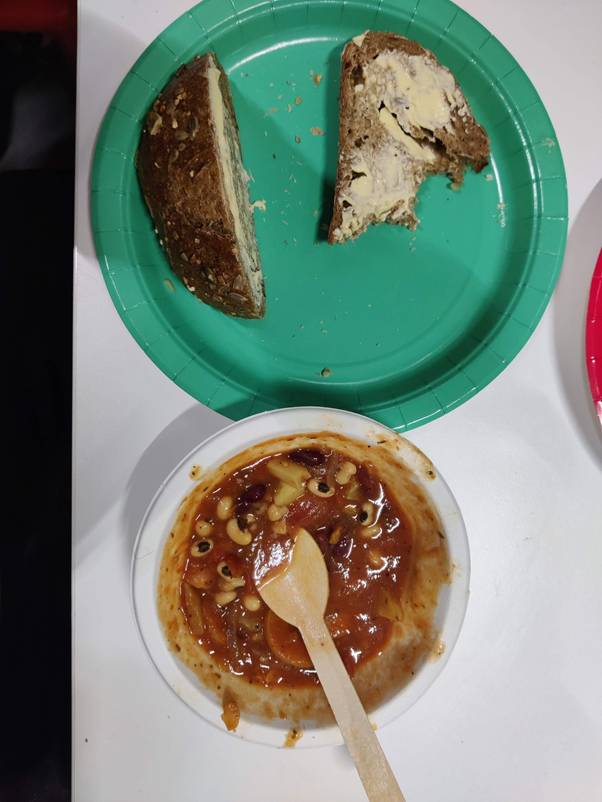 A short while later, when Kirsty and I are reading some of the 100 questions, adding some comments about “profiles”, Bill calls for everyone’s attention. There are loaves left over –expensive ones – free to a good home. He talks about the Soup Line (of which this event is not part, because it is too far south to be on a straight line drawn from Belfast to Felixstowe). He shares some examples of encounters from the actual Soup Line, where he visited people to make a vat of soup. There is some personal material in here too – the perils and opportunities of being invited to make a vat of soup, only to discover that there is just one person to share it with. He moves on to talk about the generosity of Scottish people, highlighting the contrast with expected stereotypes. The three people who brought gifts are asked to identify themselves. We discover that, completely by chance, we are standing beside Tim from Glasgow. We make our introductions.