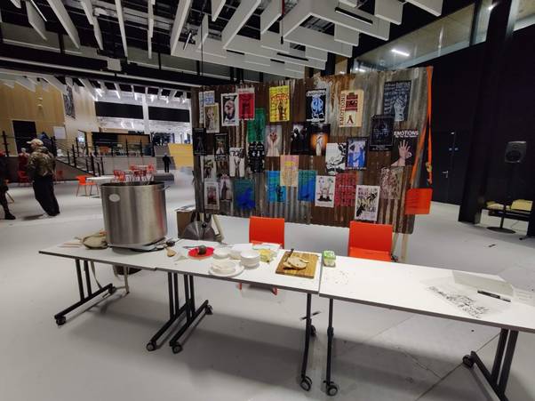 It is even wetter now. I squelch my way back to the station to pick up Kirsty. We visit the famous cathedral ruins at dusk, spotting the gathering crowds outside the gloriously restored section. We have time for a cup of tea. We head back to Shortland Coffee, where the drinks were served to a standard that I am sure would meet Bill’s approval – loose leaf tea, a proper cup and clear advice about brew time. Back across town again on foot we are thoroughly soaked by the time we arrive at the Delia Derbyshire building of Coventry University. Stewy’s painting of the four members of The Shangri Las is finished at the front. There is another of his stencilled paintings – this time of Delia Derbyshire – standing inside on the stairs. The large room where the two events are held – soup counter 5-7PM and the recording 8-9PM – is buzzing. The building is for Arts and Society studies, well chosen with its flexible spaces for different groups and activities.