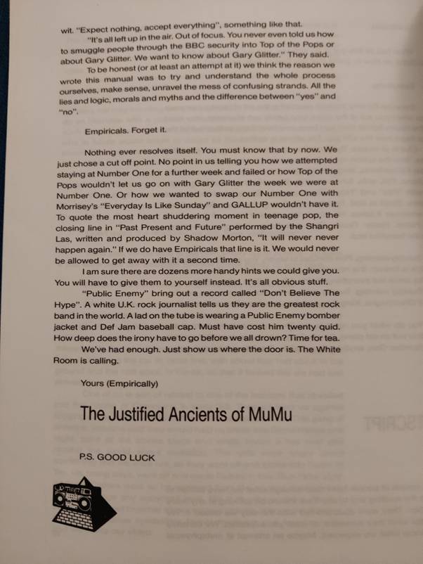 [Editor: the page before this in The KLF’s manual, in the last paragraph before the postscript, is the following line – “You do what you need to do. There was nothing behind the green door but an old piano”. Now, if you know the works of GANTOB, which I do, as I have had to edit four of their books, you will know that the “green door” idea features prominently, inspired by an HG Wells story). It is first mentioned in GANTOB in a Little Grapefruit story which is built around the name of the character in the Wells story. It receives a full pamphlet treatment by The Study Master, in answer to one of the “23 Questions” used to prompt submissions for the fourth book. A green door appears in numerous pictures and other GANTOB writings. Gillian Finks, the founder of this GANTOB project, is no longer here to ask why she featured green doors so prominently in her oeuvre. She was last seen beside a chalk door outside Waverley Station on 23 August 2025. Perhaps this key line in The KLF’s book was the inspiration, and perhaps HG Wells was Bill and Jimmy’s influence for this particular point. Or maybe it was all just coincidence or subliminal. We will probably never know. Meanwhile, the search for Gillian Finks continues].
