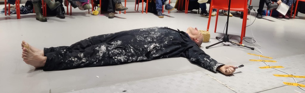 And then we are heading back to the Delia Derbyshire Building. The room is now set up with a circle of chairs, Bill supine in the middle, eyes shut, feet bare. He is the audience. We all don dark overalls. We are technicians. Tam, dressed as a minister, takes us through the order of service. You can read the plan from the 2 November 2025 entry on the Moonlight Sonata webpage. Tam’s delivery is as engaging as ever, with equal doses of humour and menace. We really do not know what is in store, despite the pre-reading. There is relief as the threat of red nail varnish mentioned on the website does not come to pass. We keep our shoes on, so there is no question of exposing damp socks, flat feet and bruised nails.